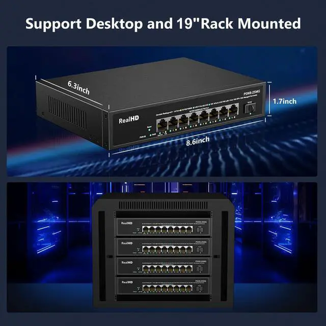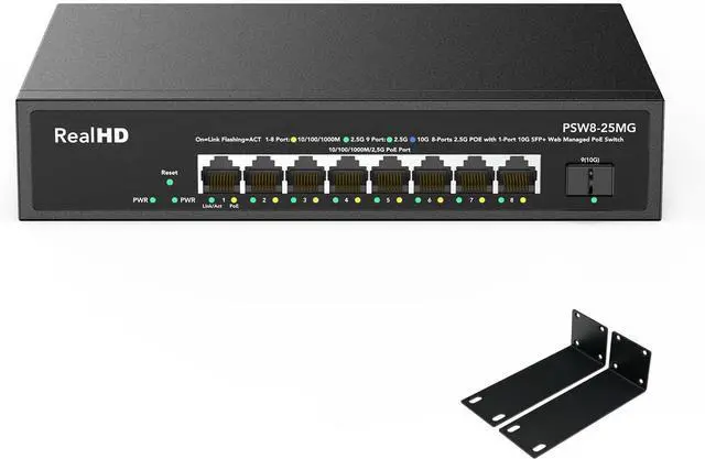 9 Port 2.5G PoE Switch9 ports 2.5G PoE Switch with 8 x 2.5G b PoE ports + 10G SFP uplinks, 10G SFPs can provide more rate and connect to different devices such as WiFi6 Router, NVR, PoE Camera.