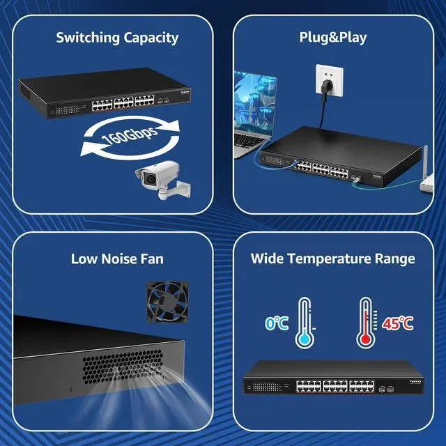 Stable and ReliableWith a durable metal case and 6KV lightning protection, this device includes a low-noise fan and dual-side cooling vents for enhanced performance. It operates within a wide temperature range of -10~50°C. LED indicator lights ensure stable operation and easy maintenance of network status.