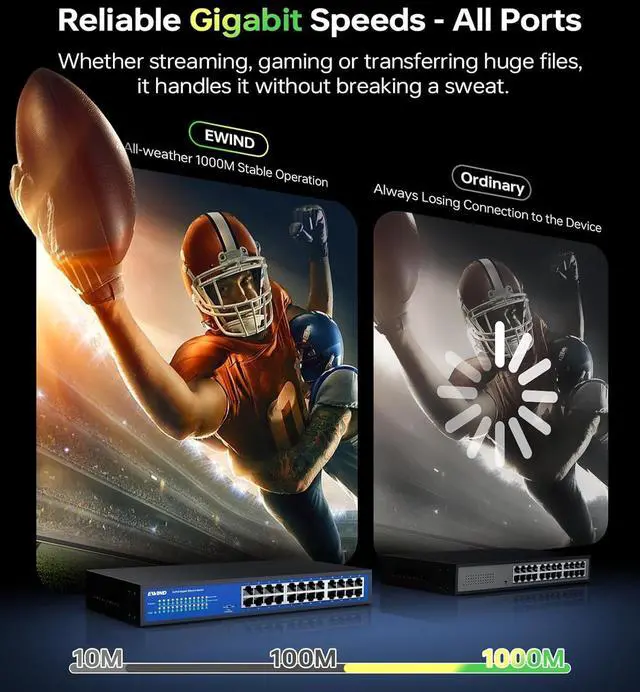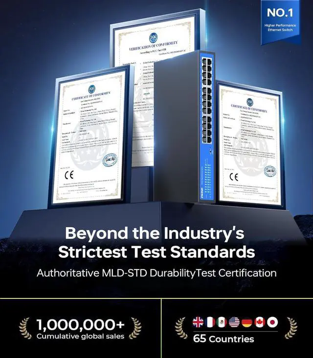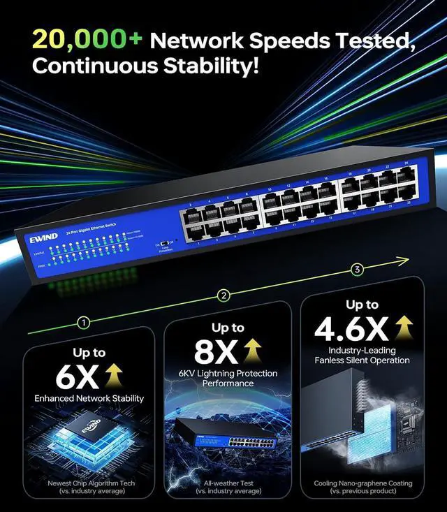 Trustworthy Gigabit High-Speed SwitchInstantly upgrade to 1Gbps without Cat6 wiringcuts installation costs & hassle by 60%! Featuring a military-grade chipset and double-shielded anti-interference circuitry, this network switch has undergone 50+ rigorous engineering testsincluding 8, 000+ hours of full-load stress testing and 4, 000+ RJ45 port plug/unplug cycles, etc. Its stability, durability, and safety perform NO. 1 among all switch, maintaining like-new performance for 7+ years.