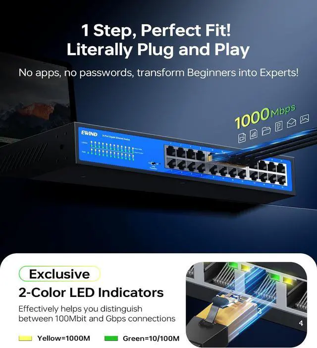 Plug & Play with Dual-Color LEDsThis gigabit switch have instant network expansion with 24 auto-sensing 10/100/1000Mbps ports. This ethernet switch supports Auto MDI/MDIX and IEEE 802.3 az energy-efficient standards. No configuration neededjust plug in for instant gigabit networking. Also, the 24 port network switch have exclusive dual-color LED design lets you quickly distinguish 100Mbps/Gbps port statuseseven beginners can manage like pros.