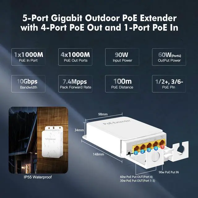 Gigabit PoE PassthroughInclude 1 PoE In 4 PoE Out Gigabit Ports, 10/100/1000Mbps rate. Powered by PoE network, no AC power supply required, Max PoE Input IEEE 802.3 af/at/bt 90W.