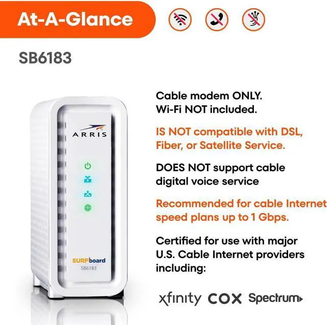 Harness the power of DOCSIS 3.0 technology to bond up to 16 downstream channels and 4 upstream channels. The ARRIS SURFboard SB6183 enhances your personal media experience, at fast broadband speed.