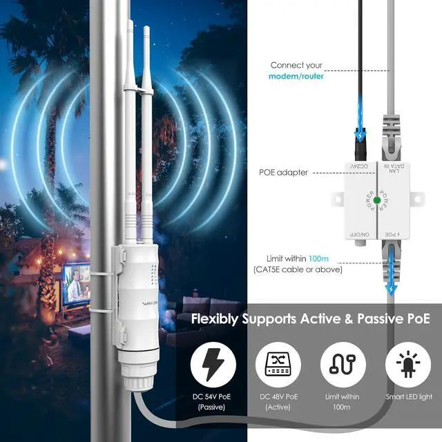AC1200 Dual-Band Range Extender: With Wi-Fi 5 technology at its core, the WAVLINK outdoor AP keeps you connected in stride with speeds reaching up to 1200Mbps. Ideal for smooth HD streaming, online gaming, and bandwidth-heavy activities. Whether you' re in the yard, by the pool, or in a parking lot, relish dependable Wi-Fi 5 connectivity wherever you are