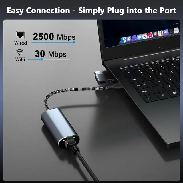 2.5G b USB Ethernet AdapterConvert your USB port into a high-speed Ethernet connection with this adapter. Experience speeds of up to 2.5G bpssignificantly faster than standard gigabit adaptersallowing for rapid data transfers across your network.