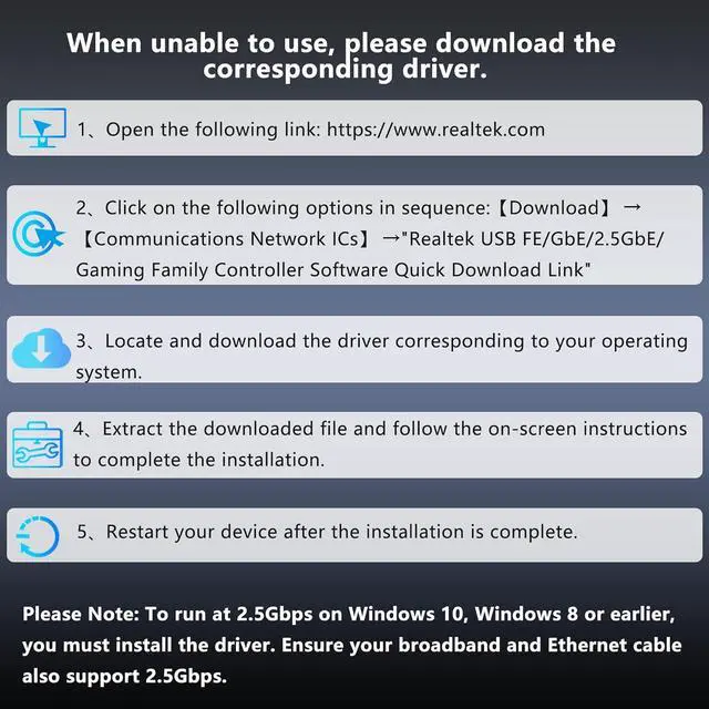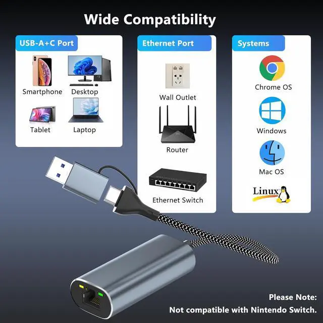 Note: NOT compatible with the Nintendo Switch. High-Performance Chip for Improved PerformanceThis 2.5G b USB computer network adapters features the Realtek RTL8156B high-performance chip. Its plug-and-play with Windows 11 and macOS automatically recognized when connected to a USB port for fast seamless communication.