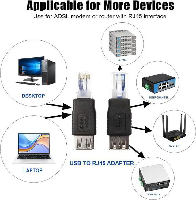 DUAL DEVICE CONNECTIONEnables USB-to-Ethernet bridging for ADSL modems/routers with USB ports; Connects professional surveillance cameras to USB-enabled devices; NOT for direct laptop internet access (requires compatible hardware) COMPATIBILITY REQUIREMENTSUSB 2.0 Female to RJ45 Male design; Requires PoE data switch for operation; Incompatible with USB 1.1 devices (printers/old peripherals)PLUG-AND-PLAY SETUPRJ45 male end connects to computer/network device; USB female port interfaces with modem/surveillance camera; No drivers needed for Windows 10/11VOIP & NETWORKING APPLICATIONSSupports data transfer for telephony systems; Ideal for IP camera installations; Compatible with DSL/Cable modem USB portsIMPORTANT NOTEHardware compatibility varies by brand; Never connect directly from router RJ45 to computer USB for internet; Confirm device specs before purchase