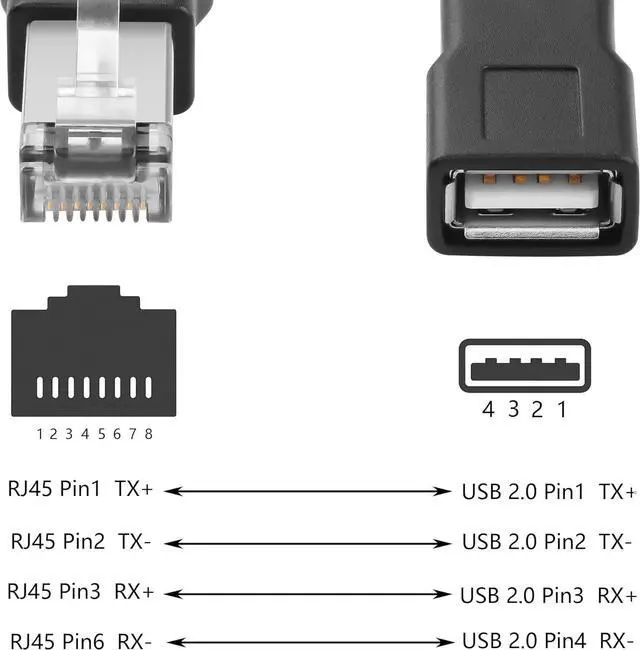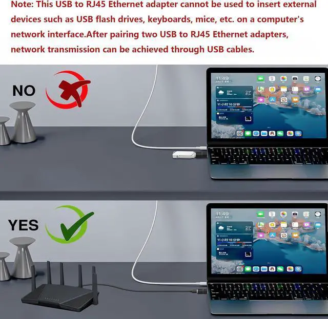 Note: This USB to RJ45 Ethernet adapter cannot be used to insert external devices such as USB flash drives keyboards mice etc. on a computer's network interface. After pairing two USB to RJ45 Ethernet adapters network transmission can be achieved through USB cables.