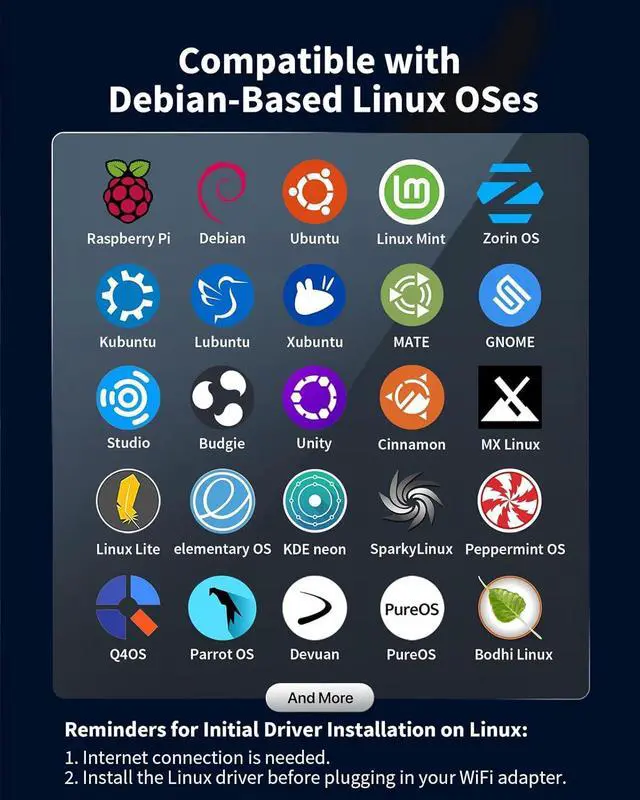 Debian-Based OSes: Supports kernels up to 6.17 Ubuntu 25.1016. 04 (all flavors) Raspberry Pi OS 138 Debian 138 Linux Mint 2218 LMDE 71 Zorin OS MX Linux Linux Lite elementary OS and more. Additional supported OSes for this Linux WiFi adapter are listed belowAX900