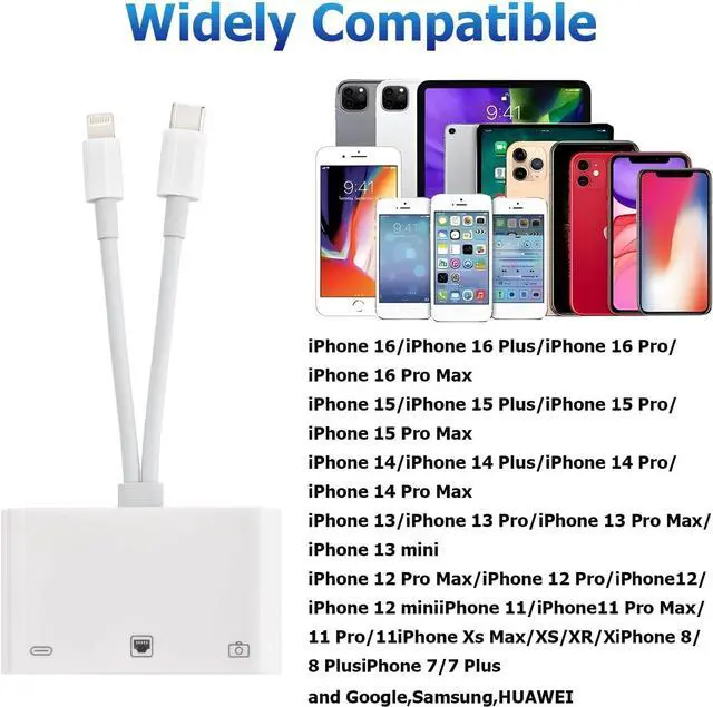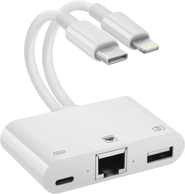 This can improve work efficiency and make you perform work easier and faster. External Charging PortThis ethernet to lightning adapter has a charging port which can charge your device while surfing on the Internet or viewing pictures or videos at the same time without worrying about potential power failures. You can also share battery power when your other devices battery power is low. 2 in 1 Muti-PerformanceThe card reader have 1 * RJ45 ethernet adapter 1 * lightning power supply port 1 * USB A slots. With the lighting charging port you will never worry about the power shortage when transferring photos.