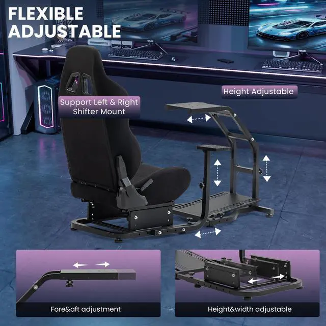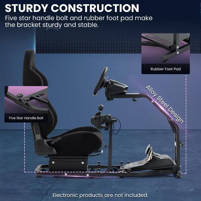 Force Feedback Steering Wheel Cockpit includes game stand and black seat. Steering wheel, handbrake and pedals not included.