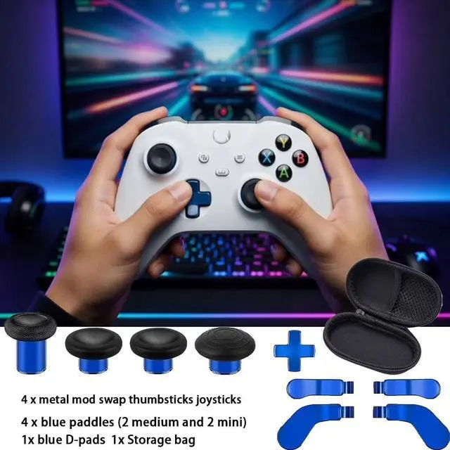 • Includes 4 thumbsticks (2 Classic, 1 Tall, 1 Dome), 4 paddles (2 Medium, 2 Mini), 1 D-Pad, and 1 compact storage case for full controller customization.