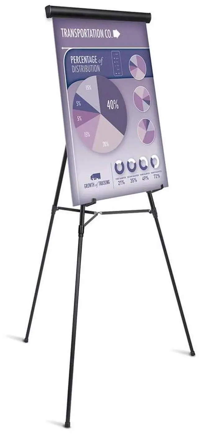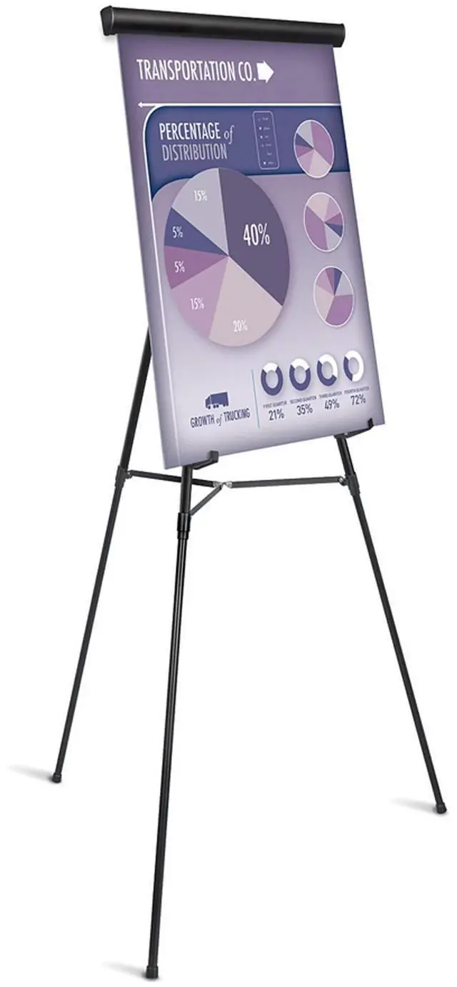 This sturdy aluminum presentation easel offers an easy and secure way to present your company's information. Use it for flipcharts or easel pads, on the floor or on a tabletop. Lightweight, telescoping legs make the easel easy to set up. Adjusts from 35 1/2" to 65" in height. Locking center brace provides stability and holds heavier items. Fit most easel pads. Locks in place to hold large or small materials. Supports weight up to 25 lb.