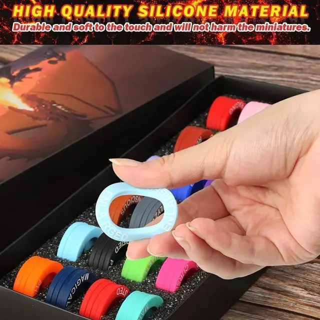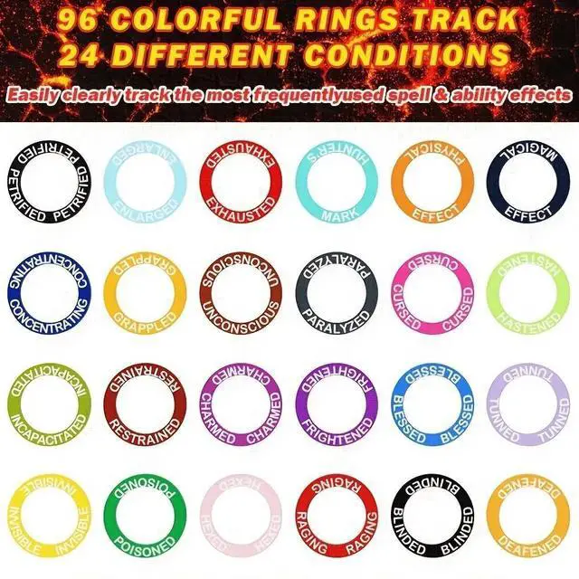 Enhance your tabletop RPG sessions with this essential status tracking set, featuring 96 acrylic rings and 24 silicone markersperfect for Dungeons & Dragons and other role-playing games. The acrylic rings are designed to slide over character miniatures, clearly indicating in-game conditions like poisoned, frightened, or hasted, while the flexible silicone markers handle area effects or broader statuses such as difficult terrain or magic shield. All 120 pieces come in a compact storage box, keeping your gaming accessories organized and easy to transport. Made with durable materials, this set is built to withstand regular use and is suitable for players ages 14 and up, making it a must-have for both casual and serious gaming groups.