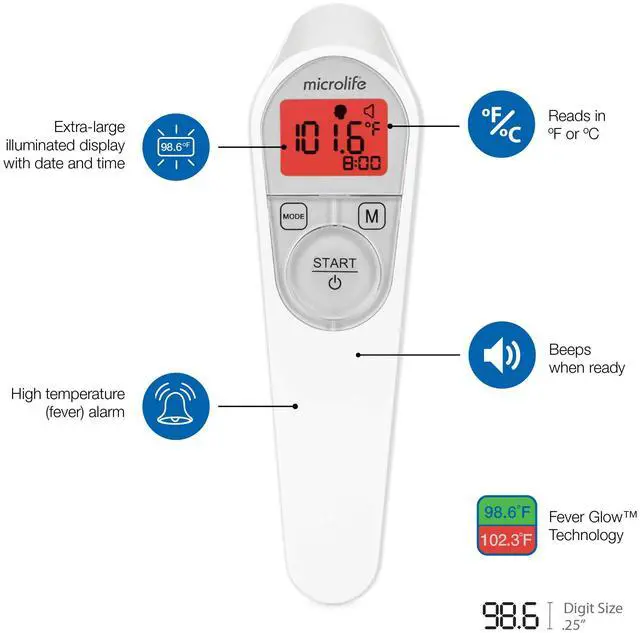 An ideal non-contact digital thermometer choice for home, office, and daycare/school. Works well for all ages. The Microlife non-contact forehead thermometer NC 200 indicates when the device is at the correct distance from body/object and takes a measurement automatically in 3-seconds to get the most accurate reading. Finally, a thermometer that makes it easy to take your own temperature! The self-indicator light glows on the handle when the device is at the right distance from your forehead whereas other thermometers only indicate on the panel which you cant see when taking your own temp. Features a sound control (on/off) which provides a silent operation that makes it perfect at night for kids and baby. Whats in the box: 1x NC200 thermometer, 1x lens cap, 2x AAA batteries, 1x English/Spanish instruction manual, and our 3 year warranty.