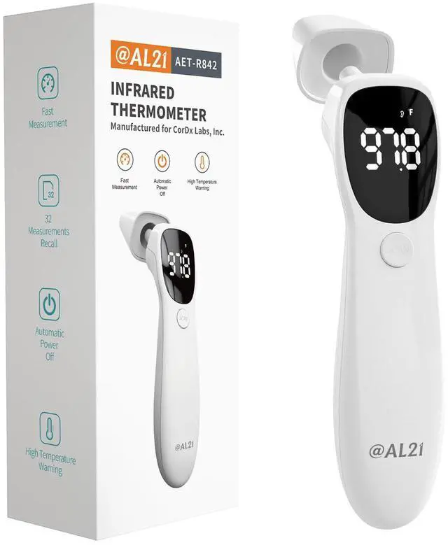 @AL21 Fast & Accurate Dual-Mode Thermometer delivers precise readings in just one second, thanks to advanced infrared sensing. Easily switch between forehead and ear measurements by removing the cap, and store up to 32 past readings for quick trend tracking. With one-button operation, energy-saving auto-off after 60 seconds, and two AAA batteries included, its ready to use right out of the boxperfect for infants, children, and adults alike. Reliable, convenient, and designed for the whole familys peace of mind.