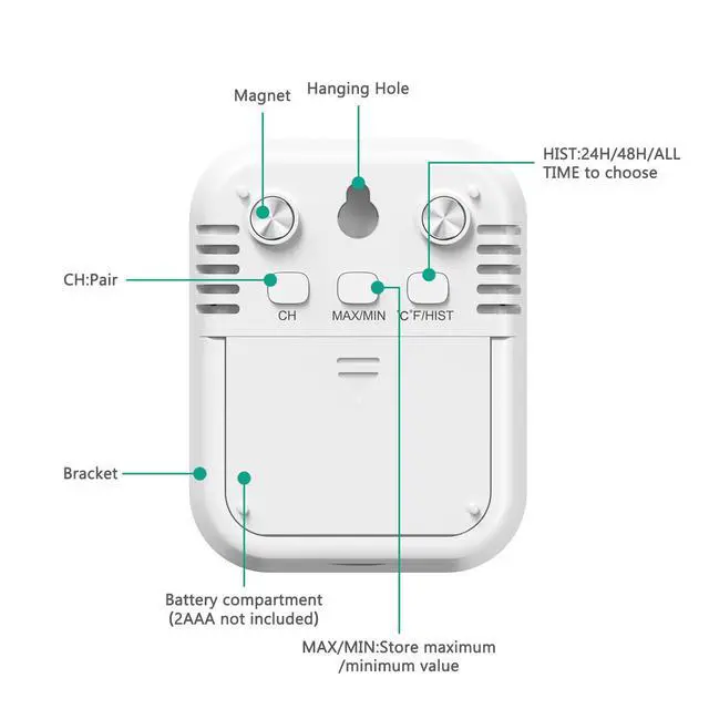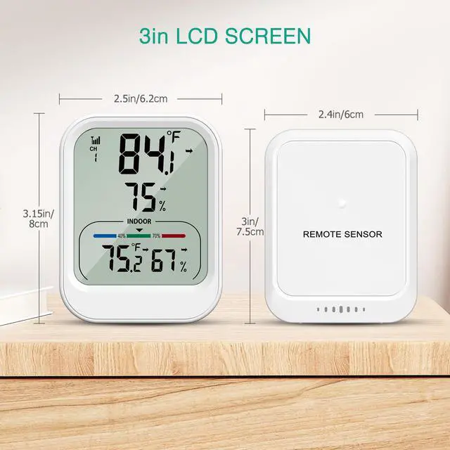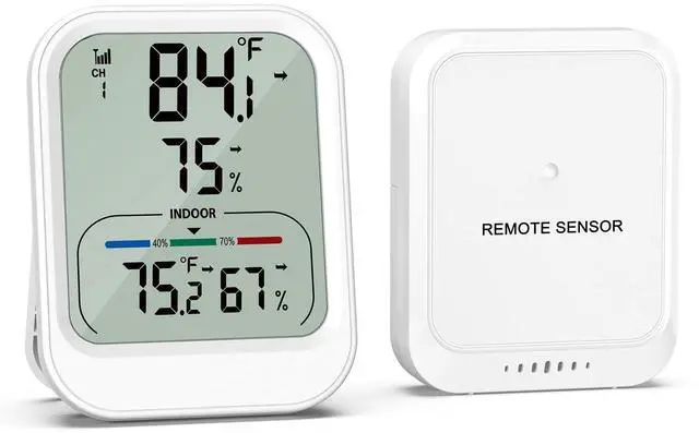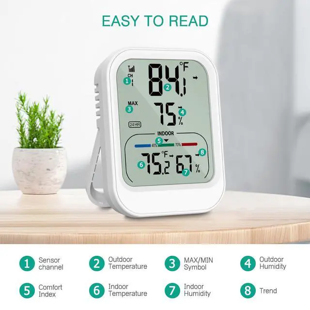 ORIA Wireless Indoor Outdoor Thermometer Hygrometer with MAX/MIN Record. Supports /°F switching and low battery indication. Distance between main unit and transmitter can be up to 100 meters. Main unit can be magnetically attached, wall-mounted, or upright, and transmitter can be upright, wall-mounted, or suspended 6. Supports /°F switching and low battery indication.