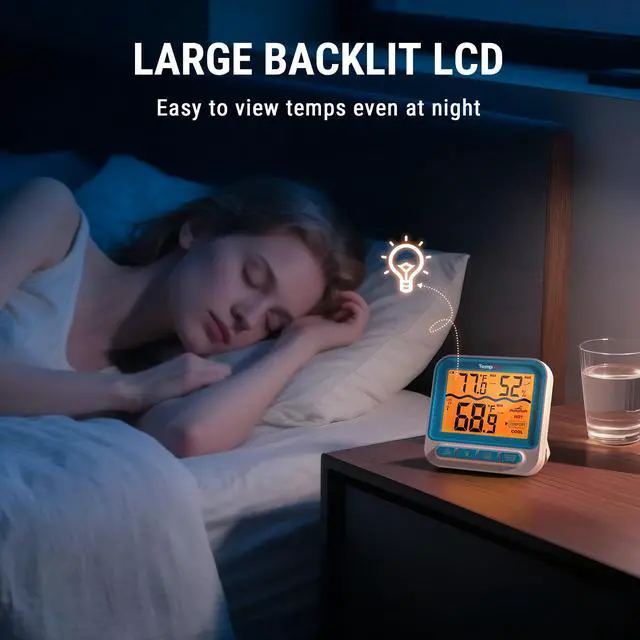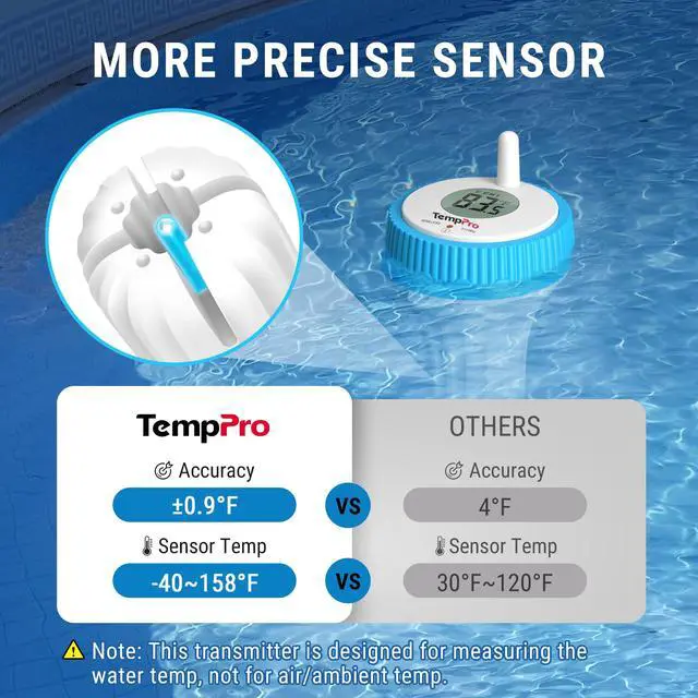 TempPro TP211B Pool Digital Thermometer TempPro IPX8 waterproof wireless pool temperature monitor is built to withstand long-term exposure to wet environments without damage, offering exceptional durability. Combining a professional-grade sensor with advanced FSK technology, this pool water temperature thermometer delivers precise, real-time temperature readings from distances up to 500 feet (150 meters)so you can check water temperatures without stepping outside. Its large backlit LCD screen ensures clear visibility, even at an angle, while the user-friendly interface lets you quickly monitor pool temperature and indoor conditions from afar. The device also tracks 24-hour and all-time high/low temperatures, along with trend indicators, helping you better plan your day! This remote pool thermometer wireless is suitable for a wide range of applications, including swimming pools, hot tubs, fish tanks, aquariums, ponds, bathtubs, and indoor living spaces. Its versatile design makes it a practical tool for monitoring water temperature and indoor humidity in various settings. Specifications: Temperature sensor transmission range up to 500 ft Indoor Temperature range: -22-140(-30-60) Sensor Temperature range: -40-158(-40-70) Humidity range: 10% ~ 99% Temperature tolerance: ±0.9(± 0.5) from 32 to 140(0 to 60) , Otherwise ±1.8(±1) Refresh Rate: 50 seconds Sensor Type: NTC Power: 4 X AAA 1.5V battery Components: 1 x Receiver 1 x Transmitter 1 x Rope 4 x AAA Batteries 1 x User Manual