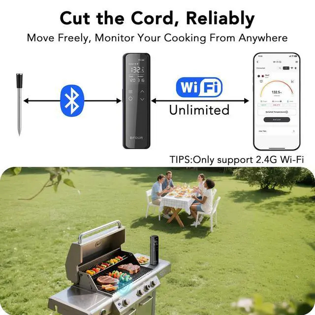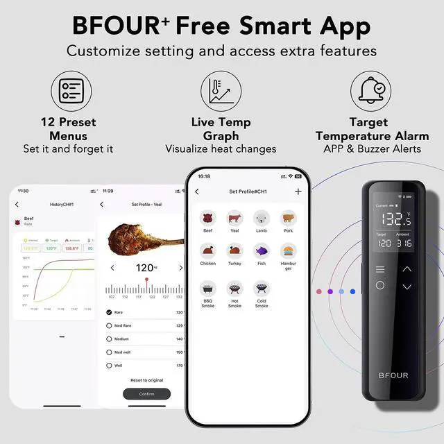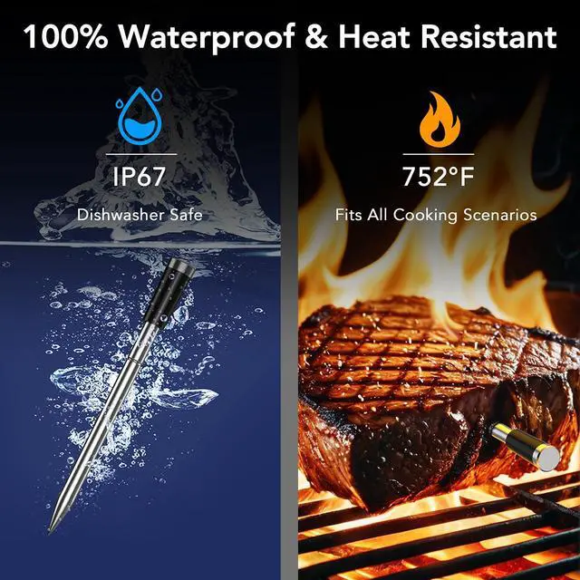 Meat Thermometer with Smart App: Enjoy flexible, hands-free cooking with this cooking thermometer. Monitor your cooking progress anytime, anywhere using the free Android and iOS app, making it easy to achieve perfectly cooked meat every time. A true game-changer for barbecues and grilling. Precise and durable probe: This meat thermometer digital features 6 temperature sensors that enable you to monitor both the internal meat temperature (up to 212°F) and the ambient/external temperature (up to 572°F) simultaneously.