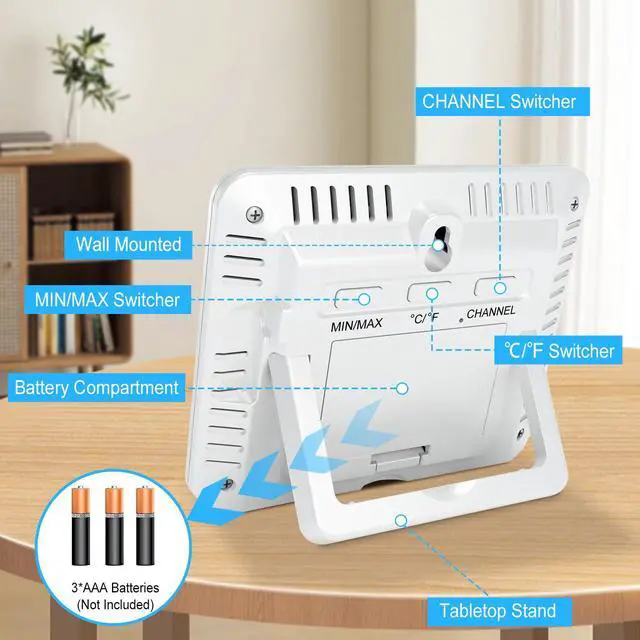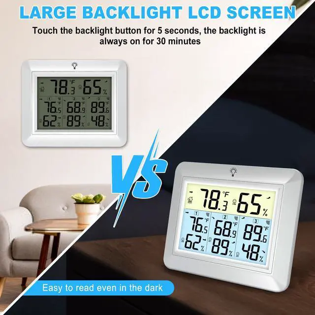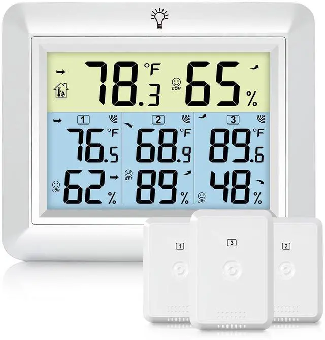Monitor temperature and humidity across multiple areas of your home or workspace with this advanced digital thermometer and hygrometer. The easy-to-read LCD display shows readings from three wireless sensors simultaneously, with clear temperature measurements in Fahrenheit and relative humidity percentages for each zone. The main unit features a backlight display with comfort indicators and can track conditions in up to three different locations using the included remote sensors. Perfect for monitoring conditions in your greenhouse, wine cellar, baby's room, or any space where precise climate control matters. The wireless sensors transmit data reliably through walls, providing real-time updates on environmental conditions. The sleek white design and modern interface make it an attractive addition to any room while delivering the accurate measurements you need. The wireless weather station specifications: Console Dimensions : 4.33 x 3.54 x 0.78 inch(11 x 9 x 2cm) LCD Dimensions: 1.6 x 2.05inch (7.5 x5.3cm) Measurement Specifications: Indoor Temperature 32 to 140 °F (0°C-60°C) Outdoor Temperature -40 to 140 °F (-40°C-60°C) Accuracy: ± 2 °F/± 1°C Resolution: 0.1 °F/°C Packaged Included: 1* Indoor outdoor thermometer console 3* Remote sensor 1* Manual