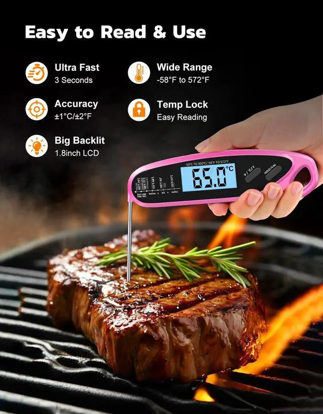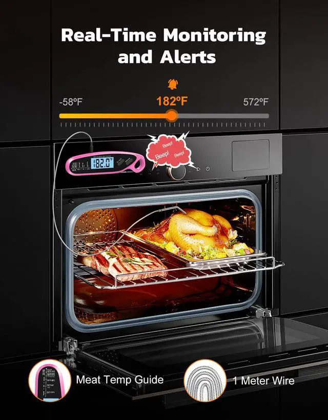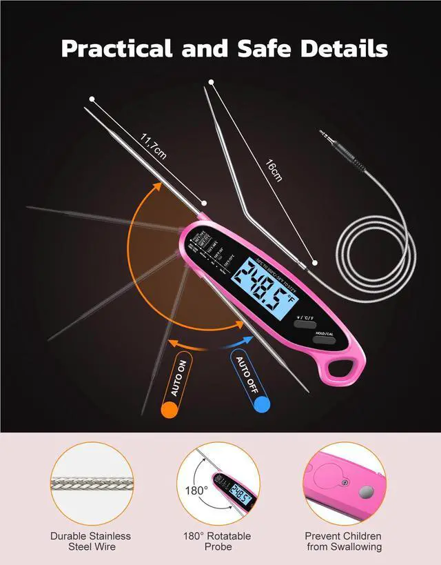 The wired meat probe of the kitchen thermometer is 40 inches long, enough to cover various areas in the kitchen and outdoors, making it very suitable for monitoring and measuring steak, roasted chicken, etc.