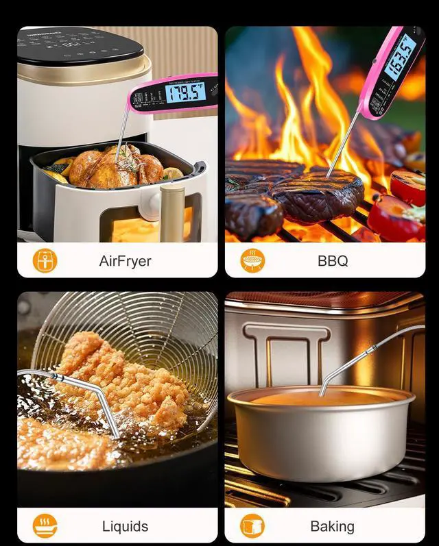This oil thermometer for frying is engraved with the optimal cooking temperature for various types of meat, including beef, lamb, pork, chicken, and fish, making it very convenient for measuring temperature and setting temperature alarms.
