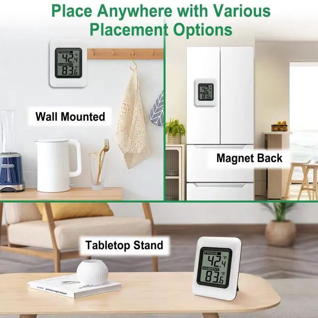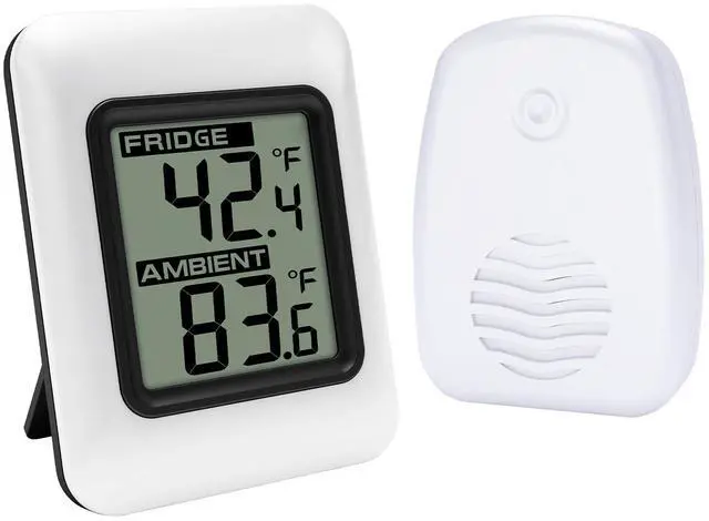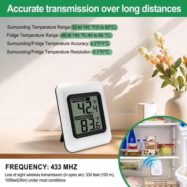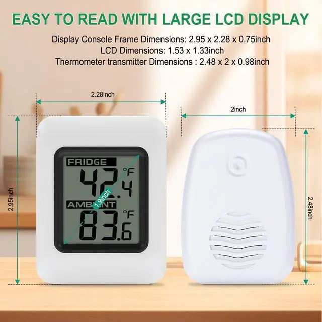 Ensure your food stays fresh and safe with our Refrigerator Thermometer. This essential kitchen tool provides accurate temperature readings for both your fridge and freezer compartments, helping you maintain optimal storage conditions. Its easy-to-read display makes monitoring temperatures a breeze, while the compact design and magnetic backing allow for versatile placement anywhere in your fridge or freezer. Battery-powered for hassle-free installation,(Not included) this thermometer is built to withstand the cold, humid environment of your refrigerator. With our Refrigerator Thermometer, enjoy peace of mind knowing your food is stored at the perfect temperature for maximum freshness and safety. The digital freezer thermometer specifications: Console Dimensions : 2.95 x 2.28 x 0.75inch (7.5 x5.8 x 1.9cm) LCD Dimensions: 1.53 x 1.33 inch Measurement Specifications: Indoor Temperature 32 to 140 °F (0°C-60°C) Outdoor Temperature -40 to 140 °F (-40°C-60°C) Accuracy: ± 2 °F/± 1°C Resolution: 0.1 °F/°C