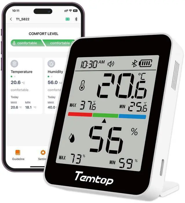 Personalize your comfort with our humidity monitor, featuring three-color comfort indicator and adjustable thresholds.