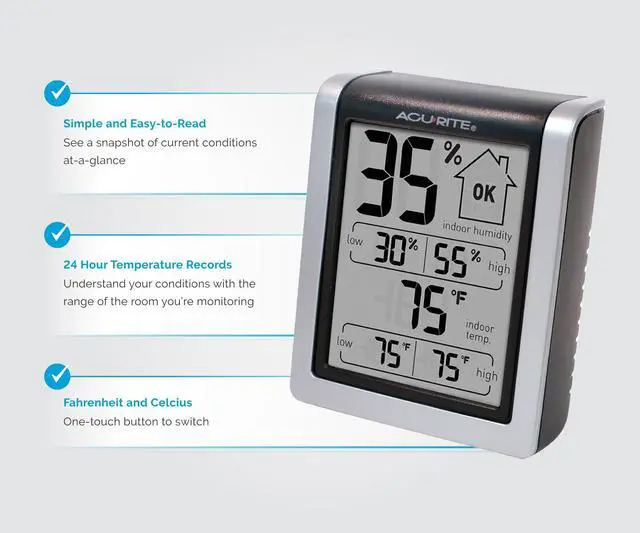 An all-in-one digital indoor thermometer and humidity gauge, the AcuRite Indoor Temperature and Humidity Monitor gives you a full picture of your indoor world. With an easy-to-read, at-a-glance display, you may access both humidity monitoring and accurate temperature as the need arises.