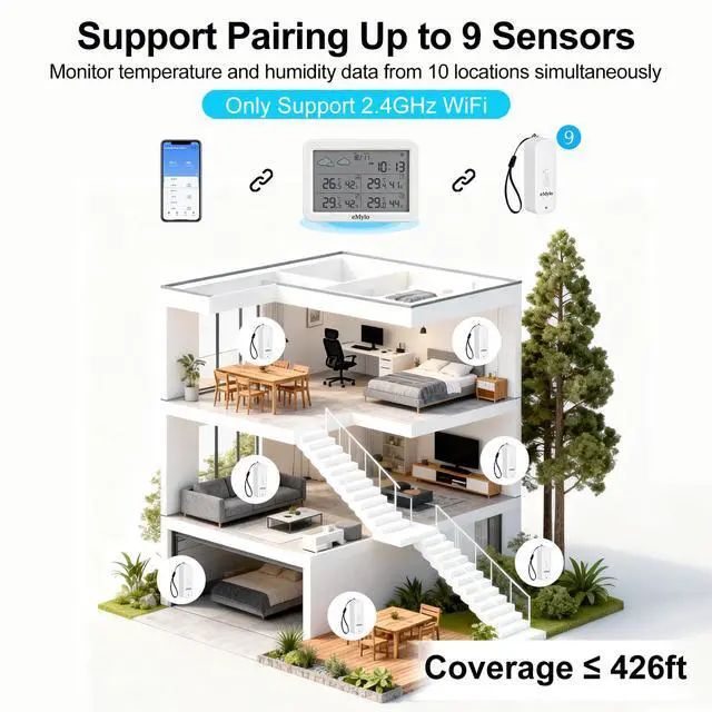 Ensure the thermometer gateway is within 49.2ft(15m) of the router in open areas using 2.4GHz WiFi (5GHz unsupported). And the transmission distance between the thermometer gateway and sub device is 492 feet (No obstacles).