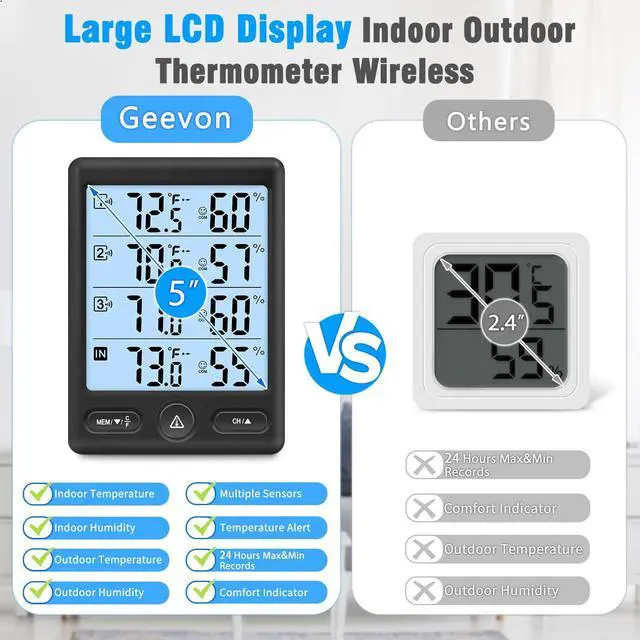 This digital indoor outdoor thermometer for home displays the inside outside temperature/humidity with tendency arrows and max&min values, comfort indicator, customizable (hi/lo) temp alerts.