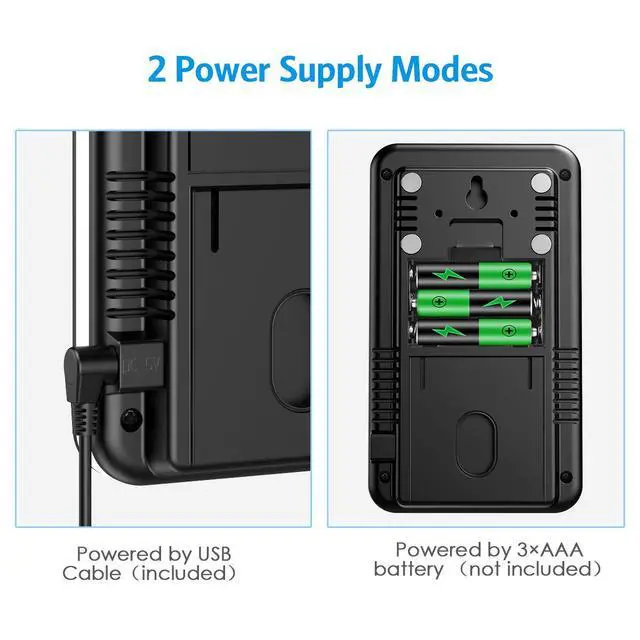 The main unit is powered by 3AAA and one sensor is powered by 2AA batteries. Neither is included.