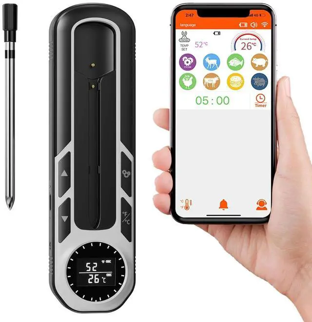 what our bluetooth meat thermometer different from other bluetooth thermometer is that we have a big LCD screen, even if you don’t want to check the temp by app, you can see the LCD screen directly, and we have a backlight design so that you can see the temp display when you have a barbecue with your friend in your yard at night.