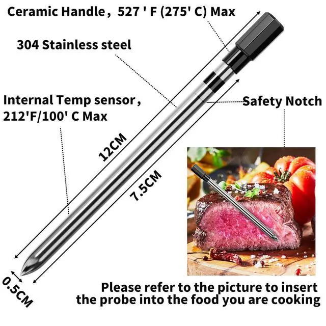 If the meat thermometer stops working please check if the host and probe have power.The probe internal temp is 212°F/100°C max and ceramic handle : 527°F/275°C max.The host temperature for safe use of the host is: - 20 C to+60.Exceeding the recommended temperature can cause damage to the probe and host.Please connect us via when you have any question about our wireless thermometer.