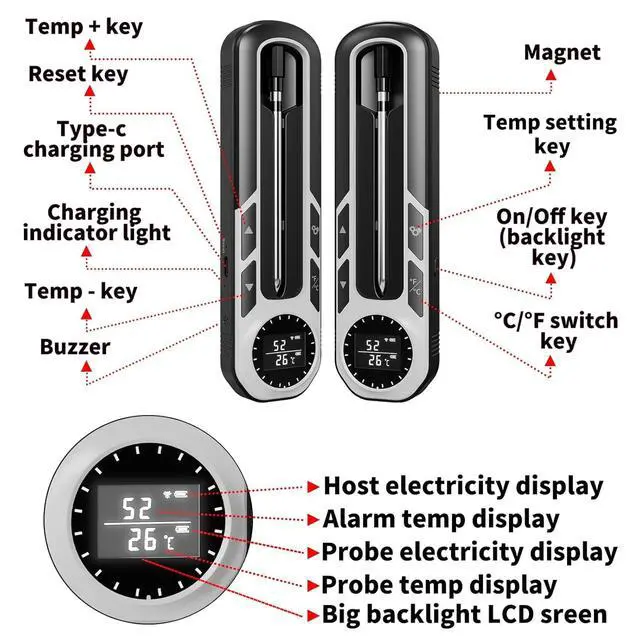 Our wireless meat thermometer can work 24H after a full charge for 30 minutes. and you can have a smoker, barbecue, or rotisserie with friends in the yard and no worry it no power.