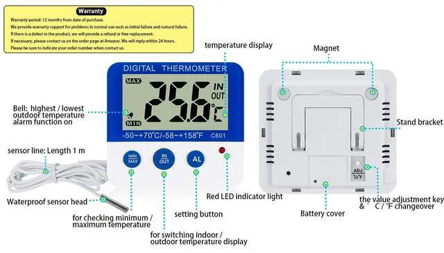 IN/OUT Key: Inner and Outer Temperature Conversion. Outer temperature is the temperature from sensor. So after inserting the sensor plug into the thermometer, you can use the sensor detect the outdoor or the freezer temperature(Put the sensor line in the freezer, close the freezer door, and put the thermometer outside the freezer);