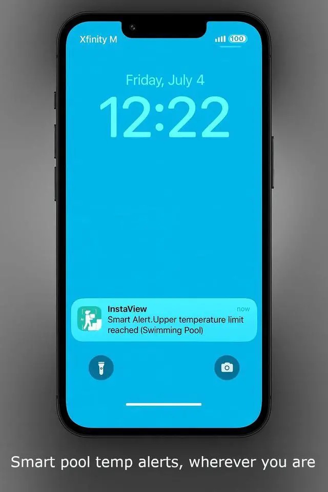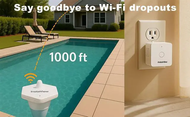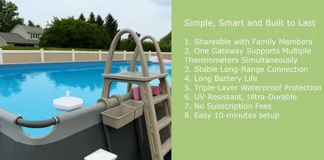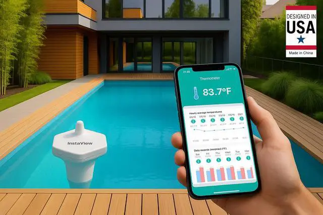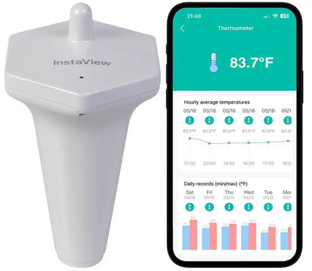 InstaView Smart Swimming Pool Thermometer is a convenient device for monitoring temperature in various environments using your smartphonesfrom anywhere, day or night. The InstaView comes equipped with a remote water temperature sensor and a gateway. It's ideal for pools, spas, hot tubs, ponds, fish tanks, or both outdoor and indoor temperature monitoring. Powered by two AAA batteries (included), the thermometer can operate for up to a year, with a low battery reminder appearing in the app when its time to replace them. The digital thermometer is built with UV-resistant and waterproof materials. Featuring patented technology, the controllable distance from the floating thermometer to the gateway exceeds a quarter of a mile . Use the included string to tie it securely to the edge of the pool.