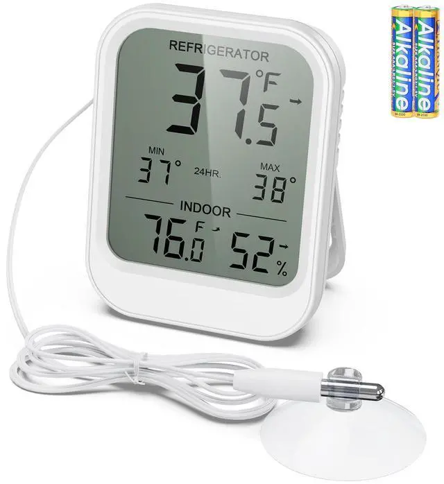 Digital fridge thermometer with large LCD display shows real-time ambient temp & humidity plus probe’s current/max/min temps—ideal for refrigerator, freezer, or wine cooler monitoring.