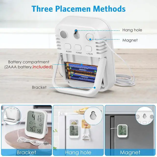 Multi-mount fridge thermometer with suction cup probe offers 3 placement options: stand, magnetic back, or wall mount; probe secures inside with removable suction cup for flexible, stable setup