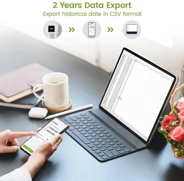 Export up to two years of historical data as CSV files; no subscription fee required; easily track temperature changes over time