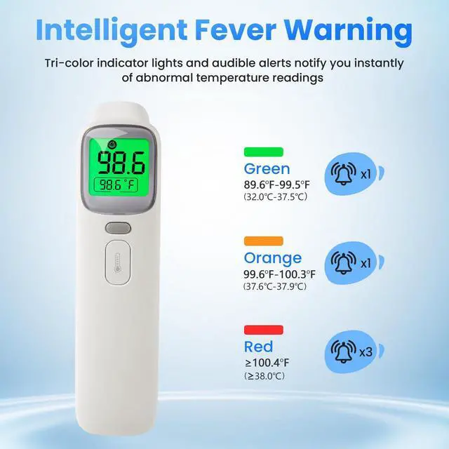 Instant Fever Alert with LCD Backlight Screen: Equipped with LCD backlight screen, the thermometer enables effortless and instant readings; It comes with a three-color backlight that lets you quickly distinguish between normal, elevated, and fever temperatures at a glance; A single beep signals a normal temperature, while three consecutive beeps indicate a fever, delivering consistent and trustworthy alerts whenever you use it