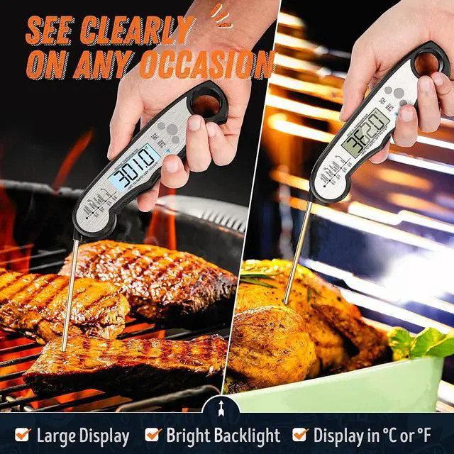 A Large Screen at Your Reach: This food thermometer comes with a large backlight screen, enabling you to see the temp clearly whether in a poorly lighted kitchen or outdoors of too much light. The built-in magnet and large hanging hole make storing it a snap. Whats more, the ergonomic handle offers a comfortable grip, letting you enjoy every step of cooking