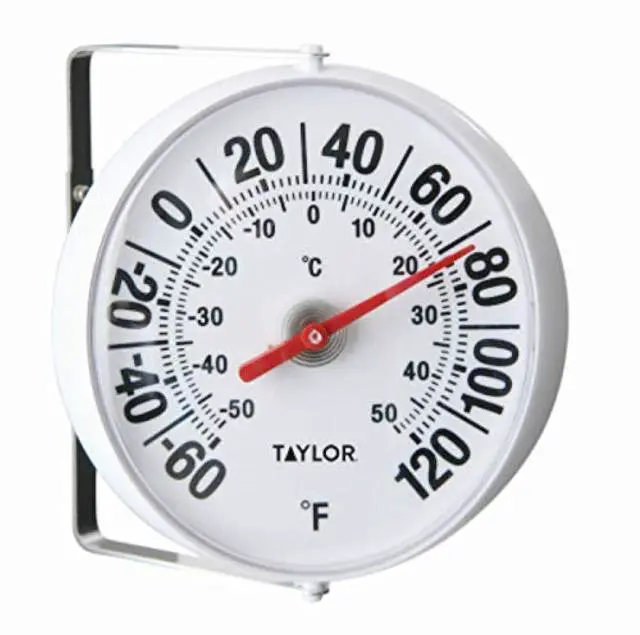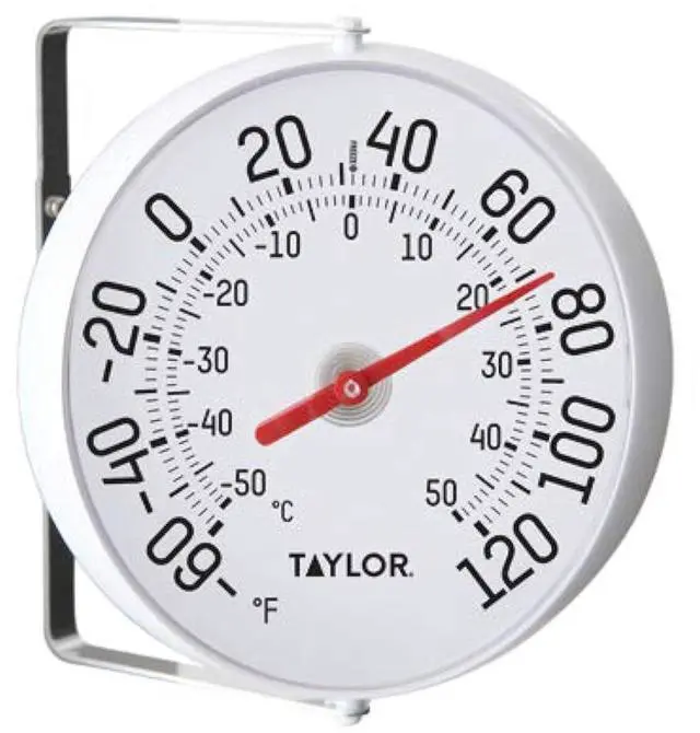 Features 5.25 in. molded dial design with bold, clean graphics & mounting bracket. Raised numbers show the current temperatures ranging from -60 degrees F to 120 degrees F. Keep up with the weather in style! 5.25 in. molded dial design with bold, clean graphics Includes mounting bracket Weather-resistant Designed for indoor or outdoor use Temperature range from -60 degrees Fahrenheit to 120 degrees Fahrenheit & -50 degrees Celsius to 50 degrees Celsius