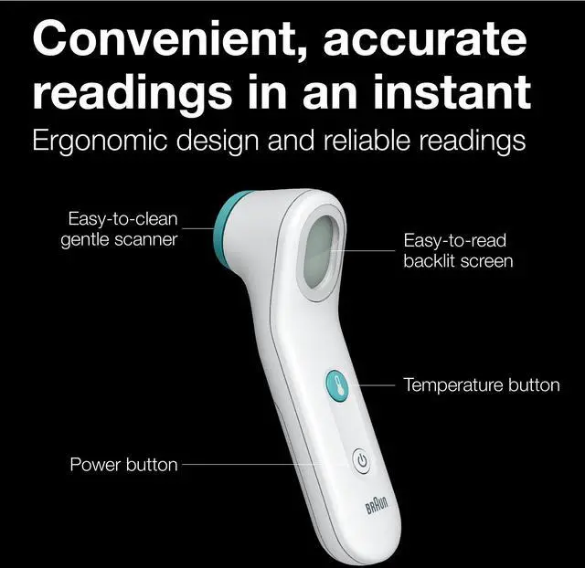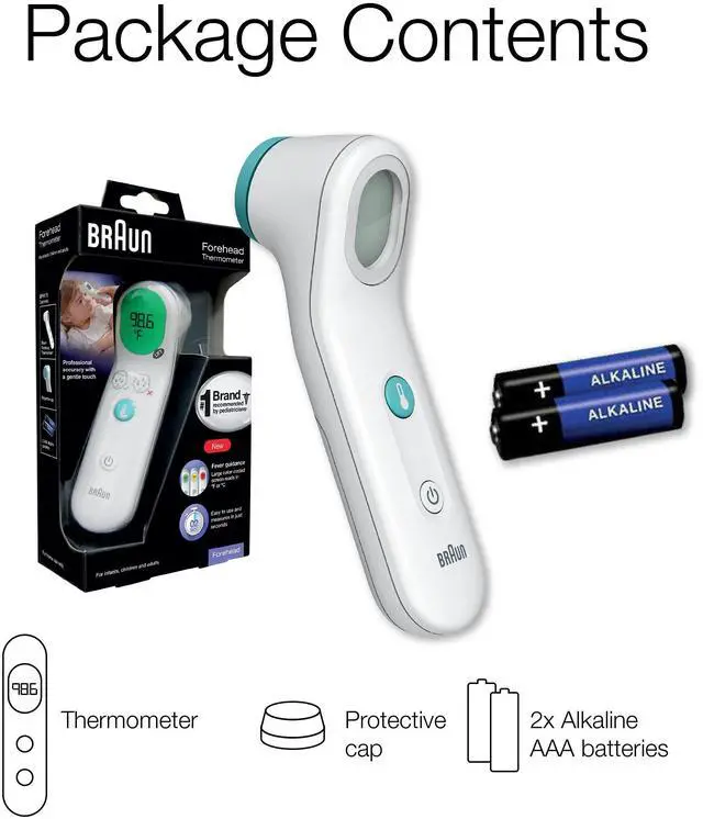 Quick and Easy to Use Head Thermometer: This Braun thermometer accurately measures temperature in as fast as two seconds with the gentle touch on the forehead; plus, it comes ready to use with two AAA batteries included
