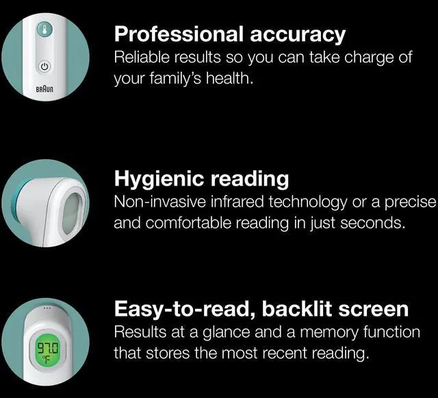 Reliable Results: Get reliable results within seconds with the Braun Forehead Thermometer; this contact digital forehead thermometer has professional accuracy with a gentle forehead touch, and can be used for the whole family