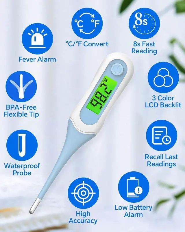 Multi-functionsDigital Oral Thermometers for Adults with waterproof, fever alert, memory display, finish beep, auto shut-off, and to mode switching, easy to use for your family