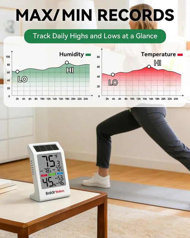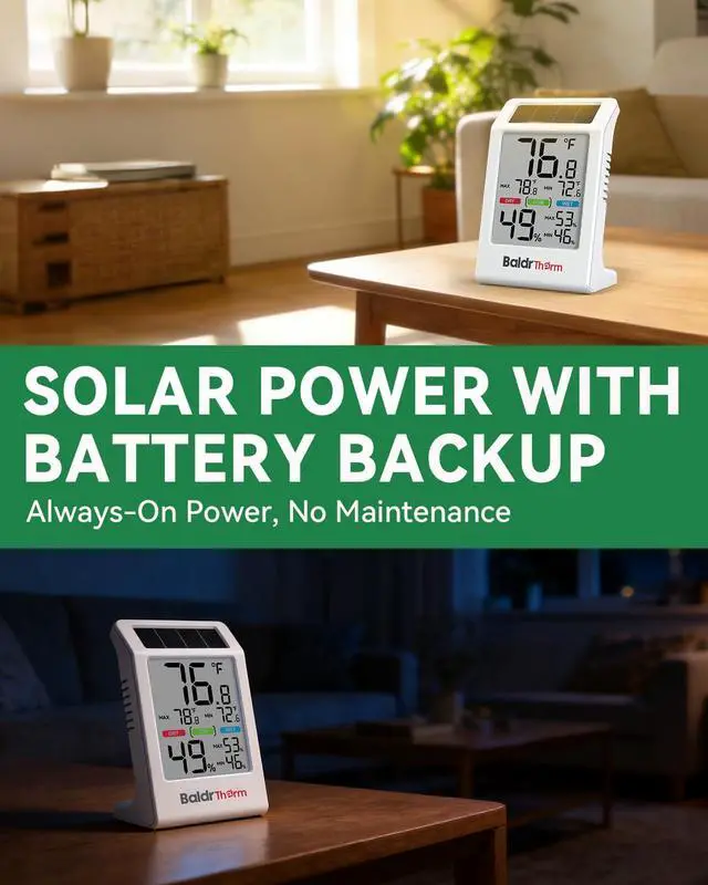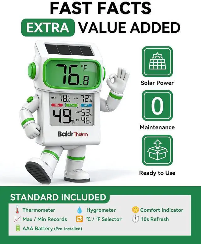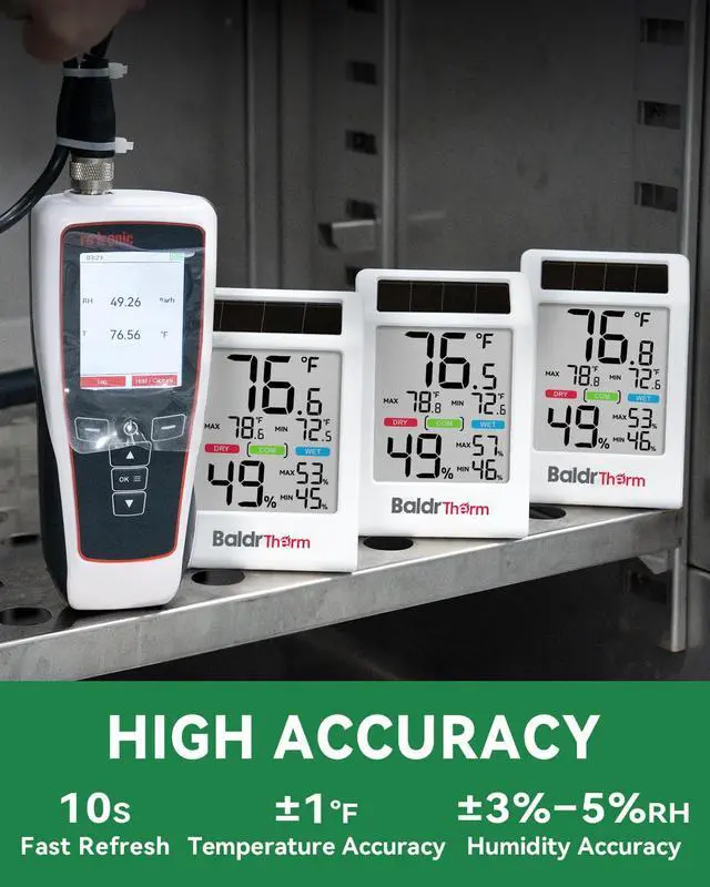 Updates every 10 seconds with ±1°F/°C temperature and ±3–5% humidity accuracy for comfort tracking.