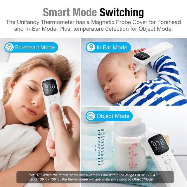 The new, state-of-the-art, infrared thermometer developed by Unifandy is the easiest and most essential way to measure temperatures of babies, children, teens, and adults, safely, quickly, and accurately. With a wide array of features such as: 3 measurement modes, choosing between °C or °F, Silent Mode, Auto-Shut-Down, and more, this is the go-to thermometer. Infrared technology gives highly-accurate readings in just one second. Simplicity, safety, and accuracy is our promise.
