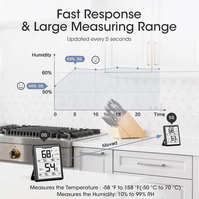 Built-in smart temperature humidity sensor, the humidity is accurate up to ±2%~3% RH while the temperature is ±2°F. Data measurements are refreshed every 5 seconds to give you lastest changes of temp and humidity.
