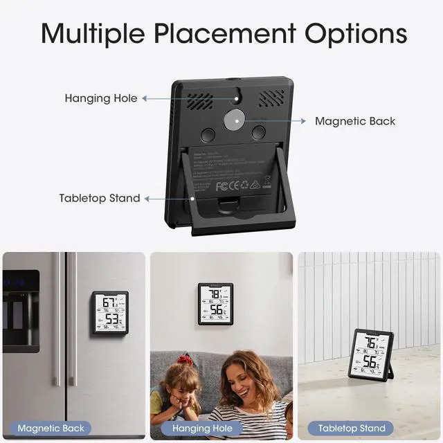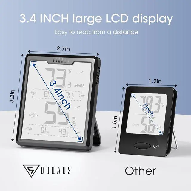 The hygrometer indoor humidity features a 3.4in LCD display with large bold numbers, allowing you to read the temperature & humidity levels clearly from any angland distance.