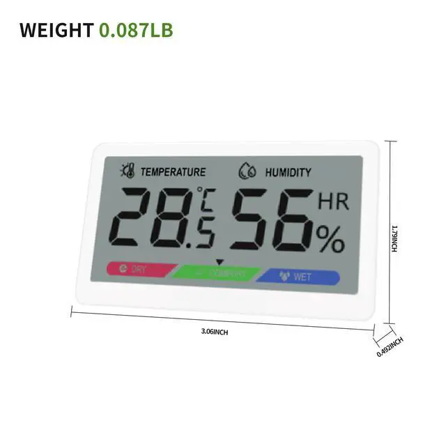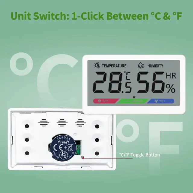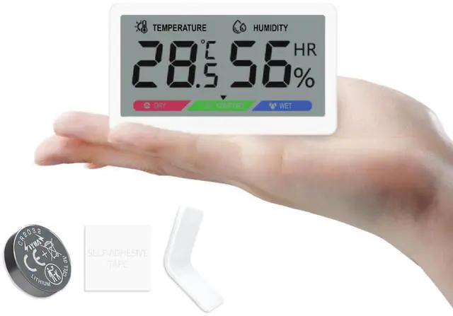 Measuring just 77.6×45.5×12.5mm, this humidity& thermometer fits anywhere and complements any decor. Its sleek white premium plastic build feels sturdy and high-end. 3 color-coded icons show humidity status instantly, with bold temp & humidity digits for easy reading. Comes with a 3V battery included—ready to use in seconds.